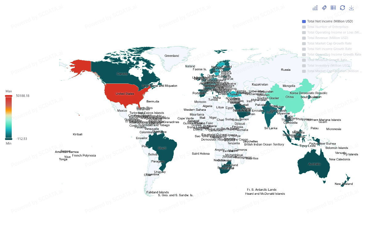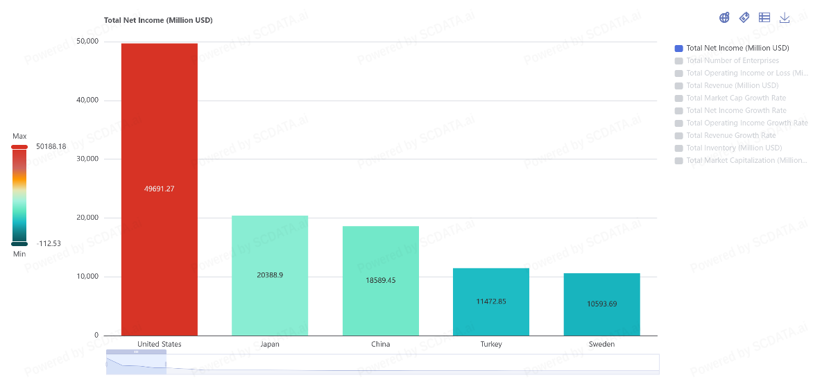 The United Kingdom operates at a much smaller scale in all four metrics. Revenue remains below $100B, and both operating income and net income remain well below those of Australia and Brazil. Assets increase gradually but remain modest compared to the other two regions. This indicates a compact, specialised market where suppliers typically succeed through technical capability, reliability, and engineering‑focused solutions, rather than through large‑volume industrial supply.