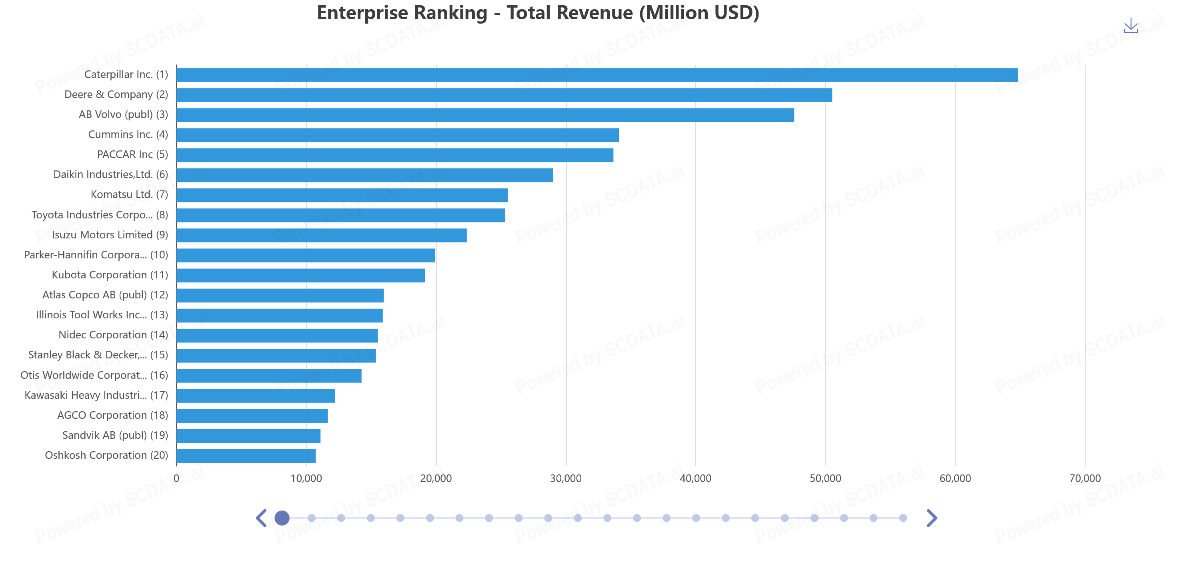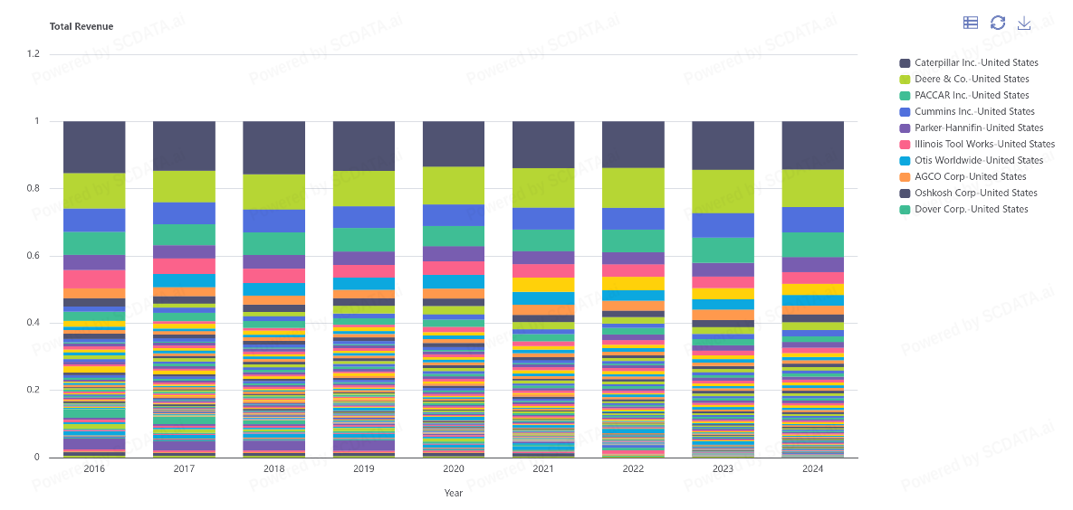 Altogether, the pattern shows a concentrated industry, where a few large companies dominate revenue while a wide base of niche players adds smaller shares. This spread hints at a market where the biggest firms, especially Caterpillar and Deere, are likely to wield strong influence in supply negotiations, maintain long‑term supplier ecosystems, and attract more attention from global vendors than the numerous smaller firms that operate with far narrower revenue slices.