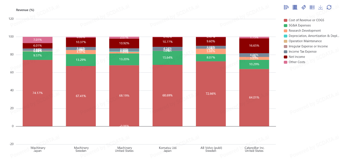This chart compares revenue splits across major cost categories for Japanese Machinery, Swedish Machinery, U.S. Machinery, and three key players: Komatsu Ltd., Volvo CE, and Caterpillar Inc. The industry bars show that Japan and the U.S. keep their cost of revenue relatively similar (both in the high‑60% range). At the same time, Sweden’s machinery sector has a higher production‑cost share and a smaller profit slice.