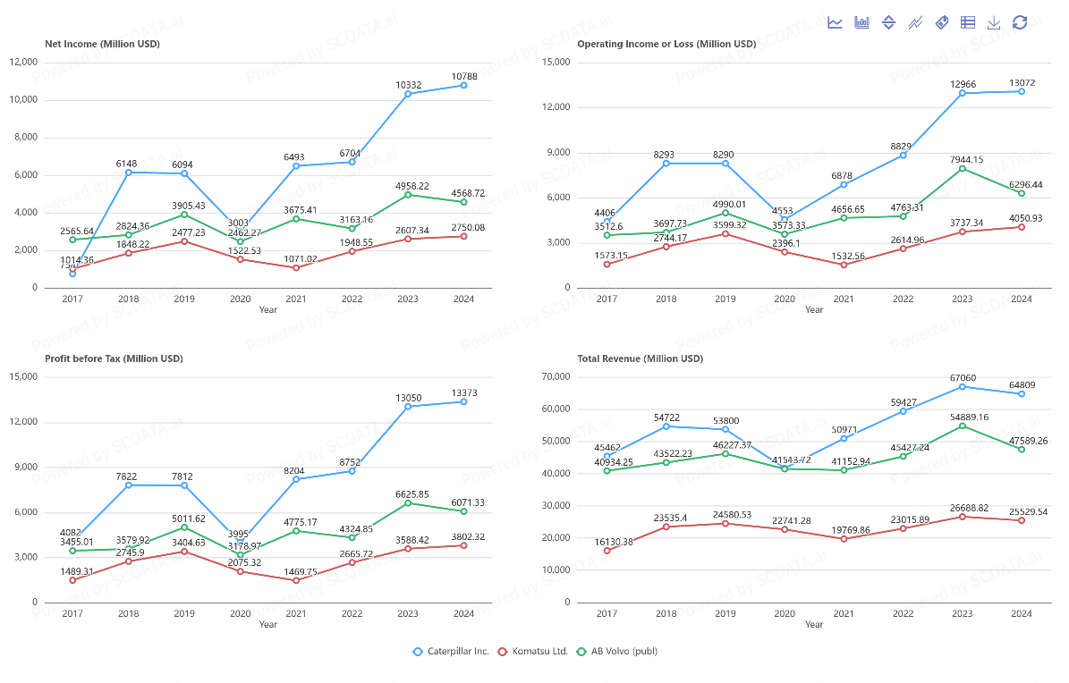 Revenue, Profit & Operating Performance: Caterpillar vs Komatsu vs Volvo (2017–2024)