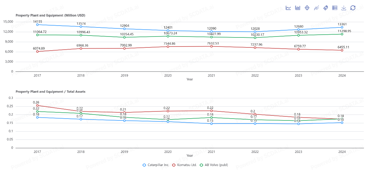 Taken together, these PPE trends show: Caterpillar operates with the largest overall footprint and greater flexibility, Volvo maintains a stable production base suited to consistent sourcing cycles, and Komatsu runs a more conservative, plant‑centric structure that relies on reliability and tight process control.