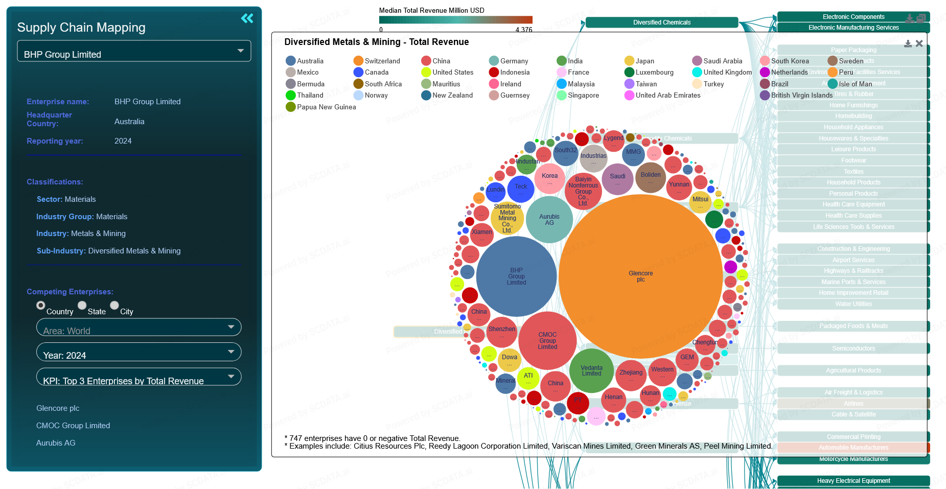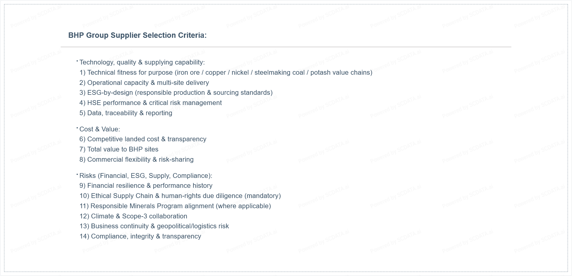 The two visuals together suggest that BHP operates in a high‑scale, highly interconnected environment where suppliers must match the expectations of a top‑tier mining organisation. Because BHP’s materials flow into so many downstream industries, suppliers should be prepared to meet stringent quality standards, maintain strong delivery discipline, and align with BHP’s sustainability and ESG requirements. Its proximity to large global competitors on the map means BHP regularly benchmarks against other diversified miners, leading to structured negotiations, competitive cost targets, and multi‑year performance expectations. At the same time, the company’s size and stability give suppliers opportunities for consistent volume, tooling support, and long-term relationship building, provided they can demonstrate reliability and maintain continuous improvement.