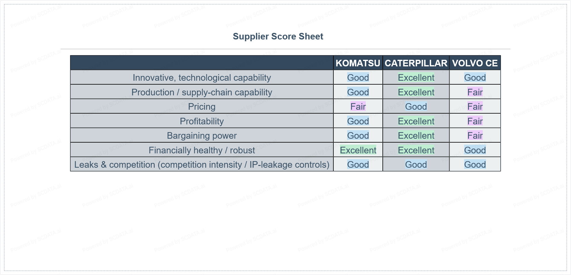 Overall, the charts show Caterpillar operating with the widest profitability and efficiency buffer, Komatsu running steady and conservative, and Volvo balancing efficiency with mid‑teens operating margins, three distinct sourcing postures that vendors should prepare for when proposing pricing, ramps and capacity plans.