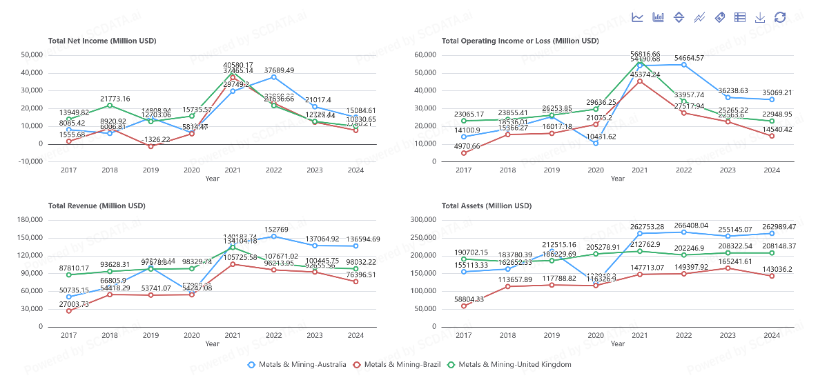 These four charts compare Mining performance for Australia, Brazil, and the United Kingdom from 2017 to 2024 across Total Net Income, Operating Income, Total Revenue, and Total Assets. Across all four measures, Australia operates at the largest scale: revenue peaks at $153B in 2021, operating income rises to $56–58B in 2022, net income exceeds $45B in 2021, and total assets remain around $260–270B from 2021 to 2024. This shows that Australia’s mining sector has strong capital, allowing buyers to support long‑term supplier agreements, large‑volume requirements, and structured price and productivity expectations.