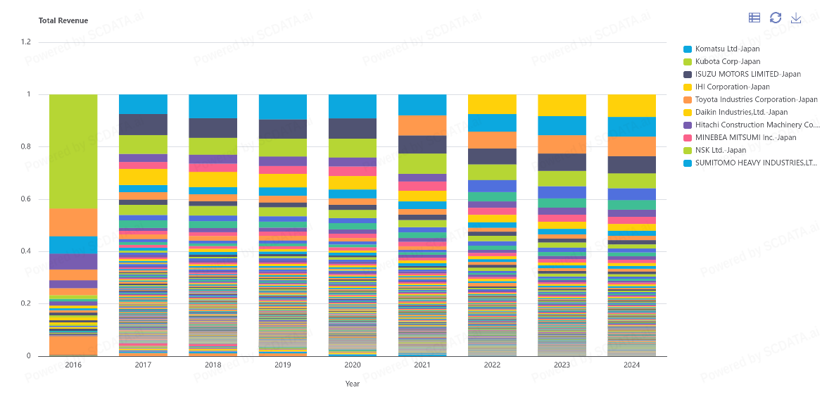 Total Revenue Distribution Across Japanese Machinery Companies (2016–2024)