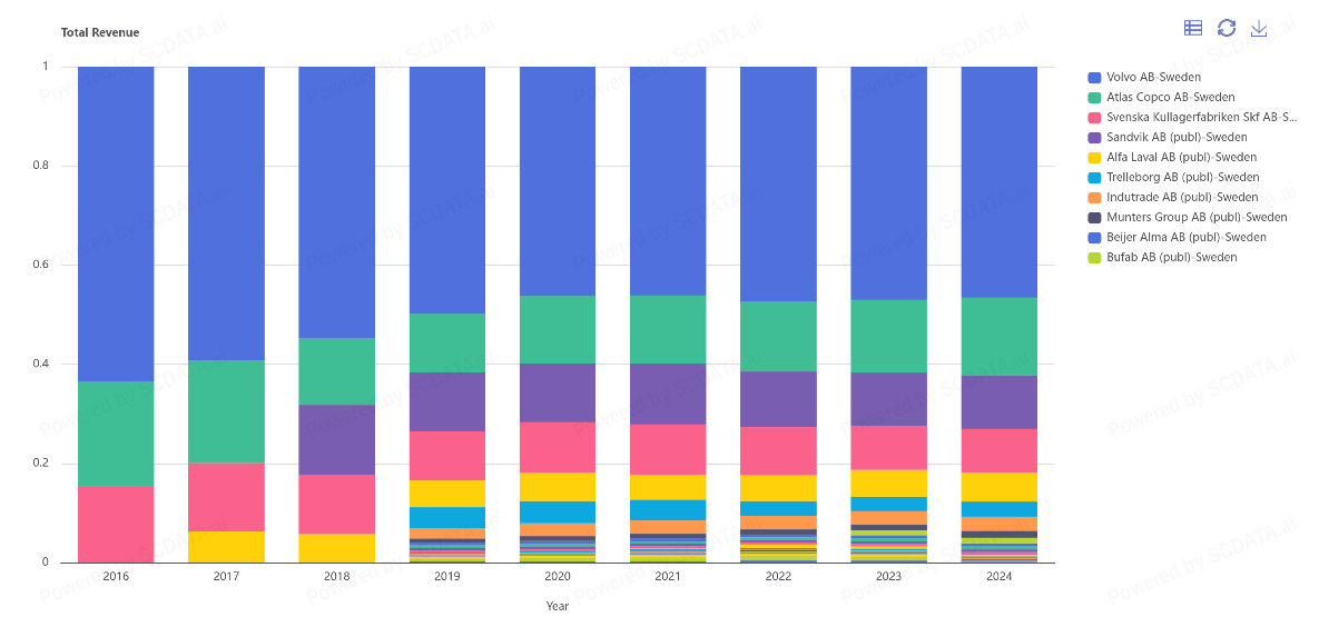 This stacked chart shows how Sweden’s machinery industry revenue is divided among its biggest companies from 2016 to 2024. The top portion of every bar is dominated by Volvo, which consistently takes the largest share year after year, showing that Volvo is the clear revenue leader in Sweden’s machinery space. Just below Volvo, companies like Atlas Copco, SKF, and Sandvik hold stable and sizeable slices, forming a strong second tier that contributes meaningfully to the country’s total machinery revenue. Further down the stack, firms such as Alfa Laval, Trelleborg, Indutrade, Munters, Beijer Alma and Bufab appear with smaller but steady shares, reflecting a broad base of specialised Swedish manufacturers that together make up the industry's long tail.