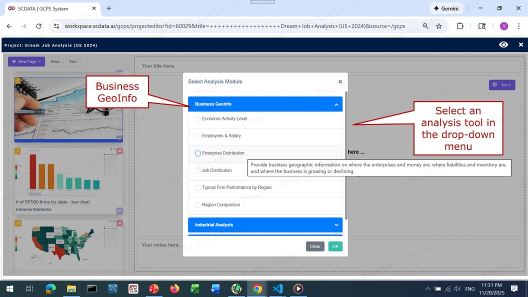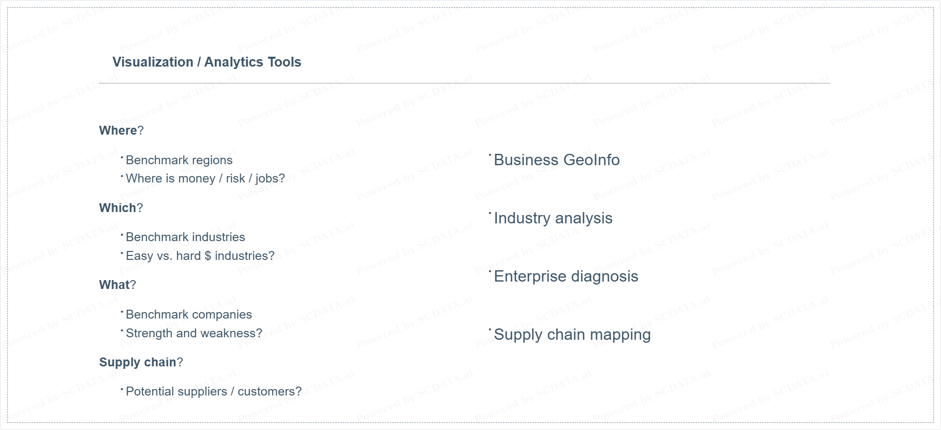 Clicking on Analysis Tools button brings up a drop-down menu where you can select a variety of analysis tools, such as business geoinfo, which projects company data to maps; industry analysis, to analyze and compare industries; and enterprise diagnosis, to compare and benchmark companies. Let’s first create an analysis for business geoinfo, which includes enterprise distribution and region comparison among others.