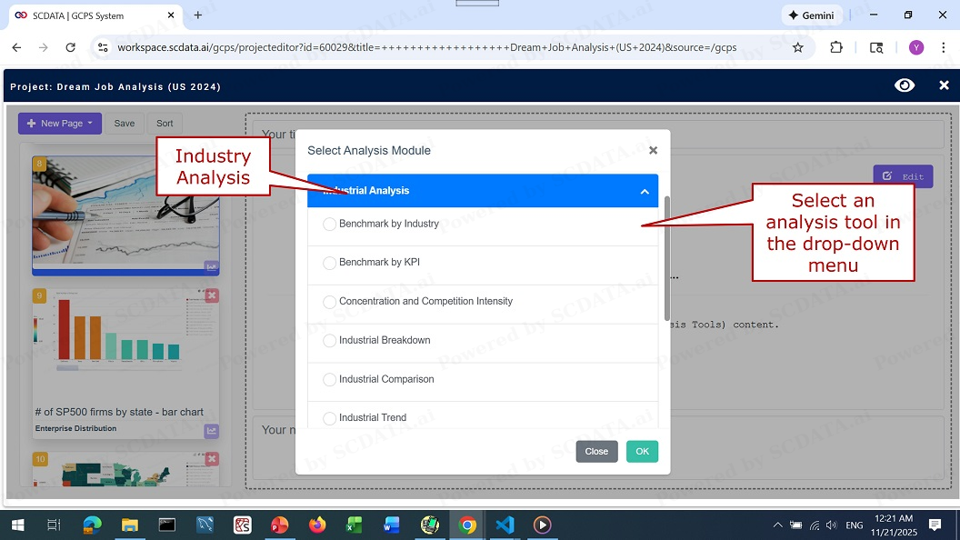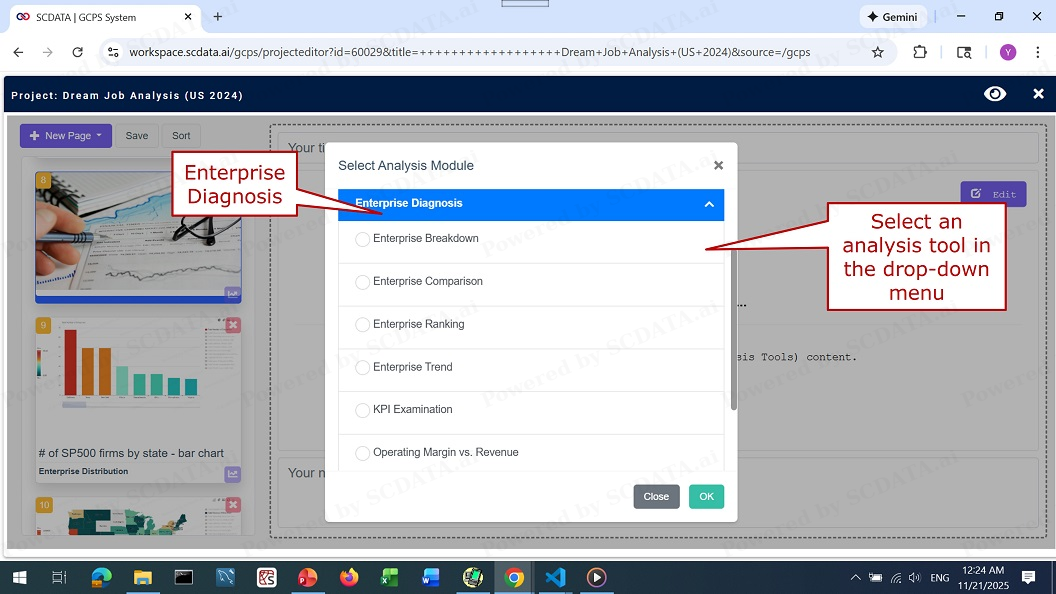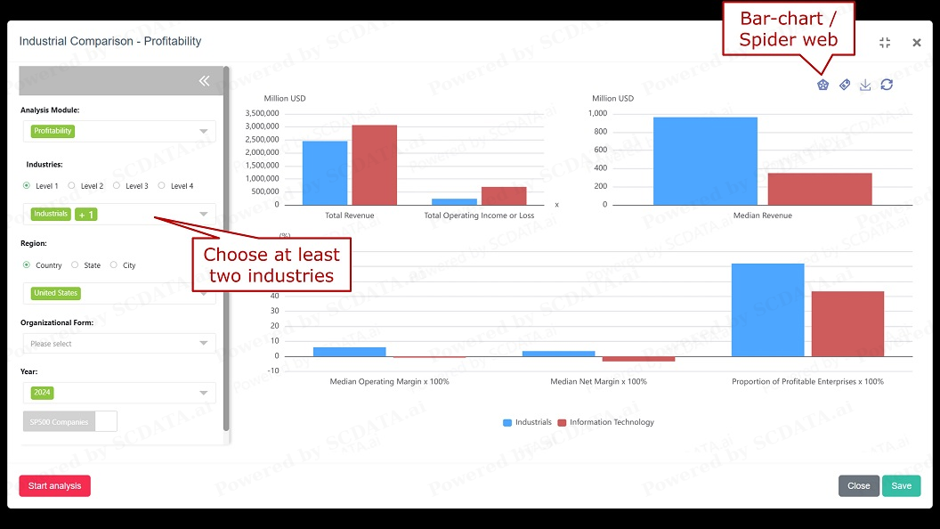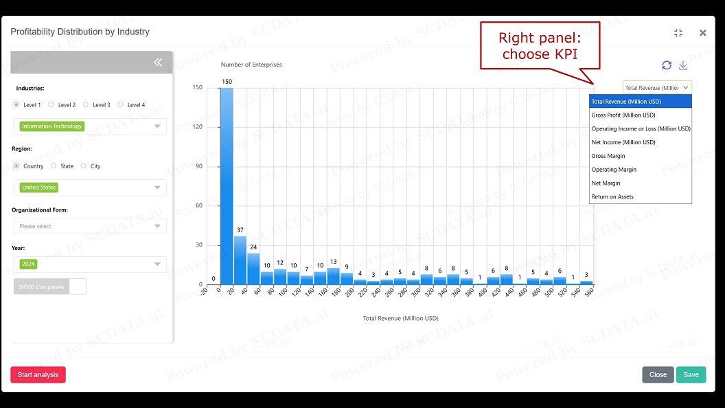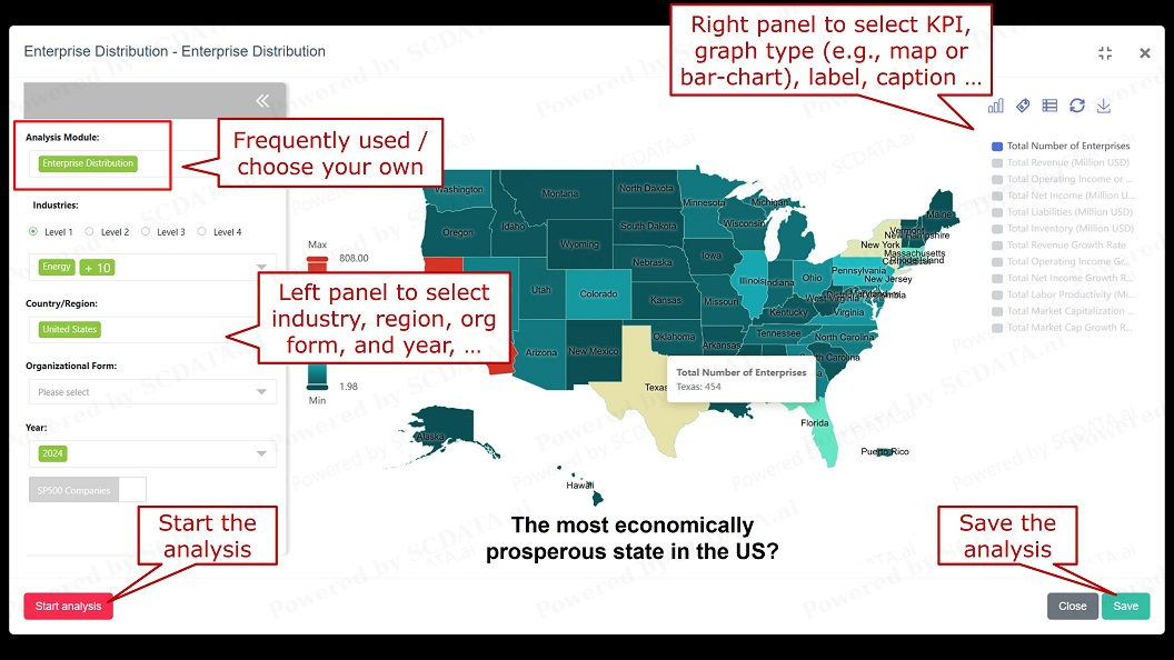 Let’s first open enterprise distribution. On the left panel, you can select analysis module, industry, country or region, org form and year. Analysis module: (1) “Enterprise Distribution” includes a broad range of KPIs frequently used, (2) choose your own: you can customize KPIs (5 categories) to show on the map. When you select industry, pay attention to the levels: the higher the level #, the more granular the industry classification is, for instance, industrials – transportation - airlines. After selecting the level, you can search for industries. Next you can select region / country: ~100, search. Year. Then, click on start analysis, a map is now generated. On the right panel, you can select various KPIs to show on the map. On the top of the right panel, you can select graph type, show or hide label, open or close right panel, and download picture. Finally, you can save your analysis here.