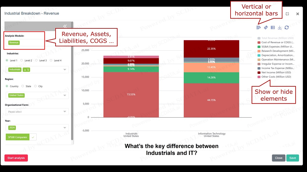 Left panel: analysis module on different breakdowns, such as revenue breakdown, assets breakdown, liabilities breakdown ...