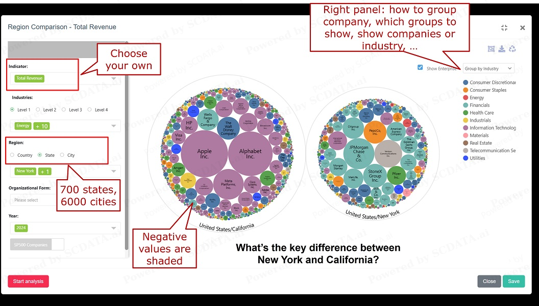 Let’s then open region comparison, for instance, to compare two states of the US: New York and California. Left panel: indicator (5 categories of choosing your own), region (country, state, city). Right panel: how to group companies, which groups to show, show companies or just the industry. Picture: negative value is represented by shaded circles.