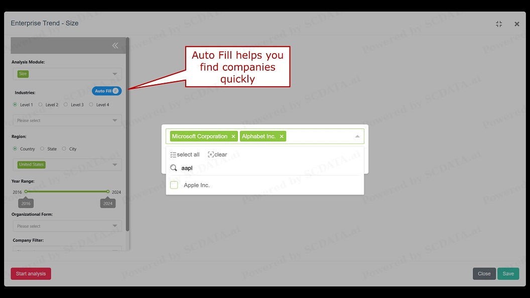 Auto fill can quickly get you the companies you want. If you know the industry classification of the companies that you are interested in, just select the industry and then in the company filter, select the companies. But if you do not know, you can use auto-fill to search companies by ticker symbol or name etc., which automatically fills other parameters, such as industry, country, on the left panel. For example, if I want to compare Apple, Google and MSFT, …