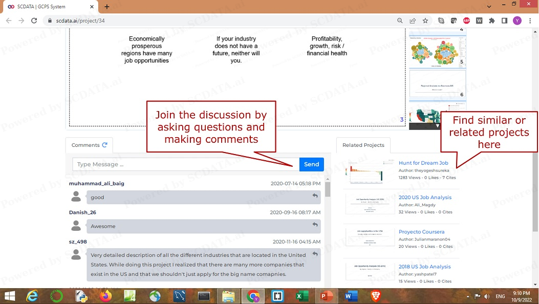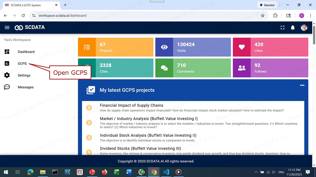 In your workspace, you will first see your dashboard which summarizes your activities, such as, your current projects and your interactions with other users, for example, likes, cites or copies, comments. If you want to create some analysis, please click on GCPS.