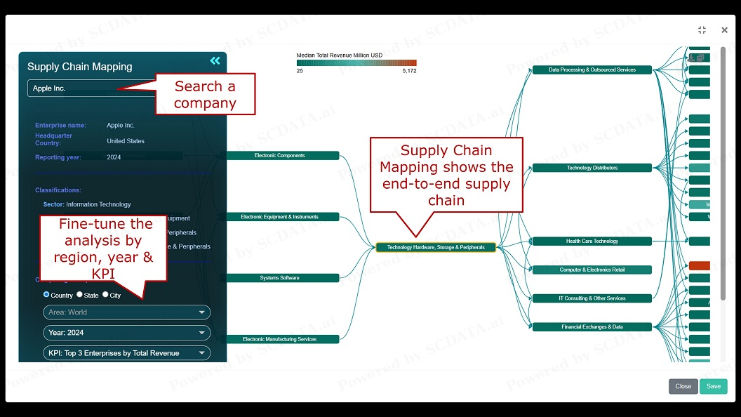 Map out a company’s upstream and downstream industries in the supply chain to identify its potential suppliers and customers. … We can illustrate supply chain mapping by Apple. Apple is classified as technology hardware. You can see its up or down stream industries. You can fine tune the analysis by region, year and KPI.