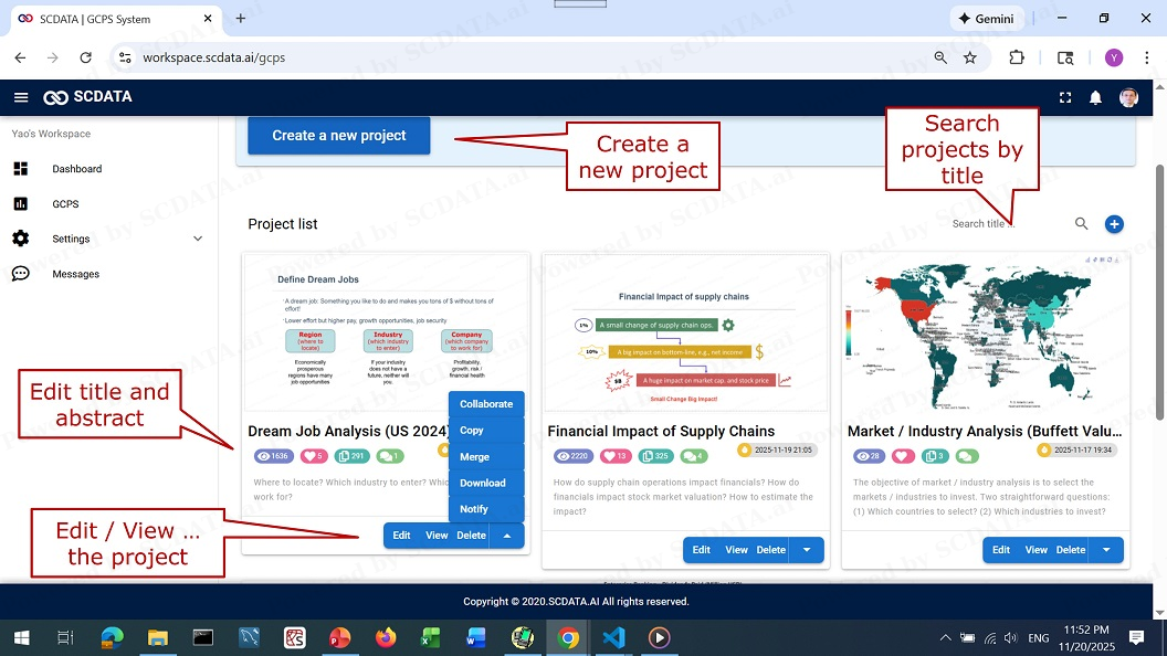In GCPS, you can create a new project and search for existing projects by title. You can edit the title and abstract of a project. You can also edit the content of a project, slide-show / view the project, and delete the project. Finally, you can invite other users to collaborate on a project, copy a project, merge multiple projects into one, download a project into PDF file, and notify your followers of this project.