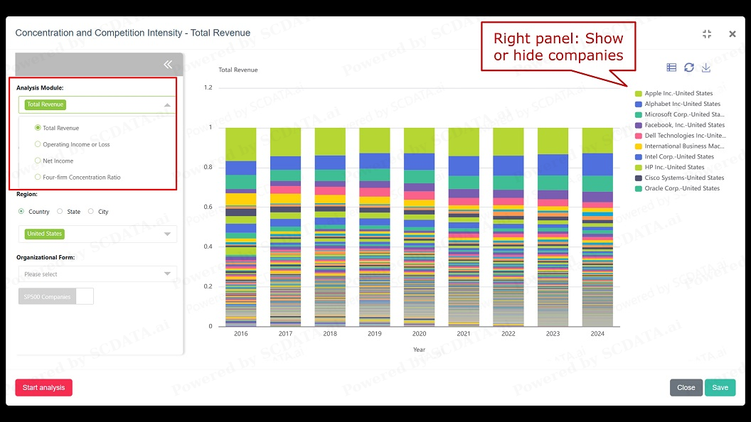 Left panel: analysis modules on different metrics, such as total revenue – market share analysis, split of profit, four-firm concentration ratio.
