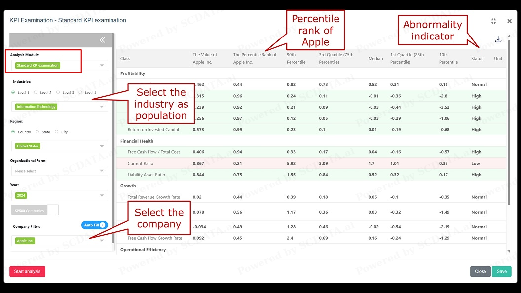 Select a company and compare it to a population to see where it stands in terms of percentile rank. It also displays the abnormality indicators such as normal, high or low.